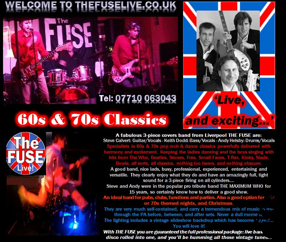 A fabulous 3-piece covers band from Liverpool. The Fuse are specialists in 60s & 70s pop rock & dance, powerfully delivered with harmony and excitement! Keeping the ladies dancing and the boys singing with hits from The Who, Beatles, Rolling Stones, Small Faces, Free, T Rex, The Kinks, Slade and David Bowie to name but a few!